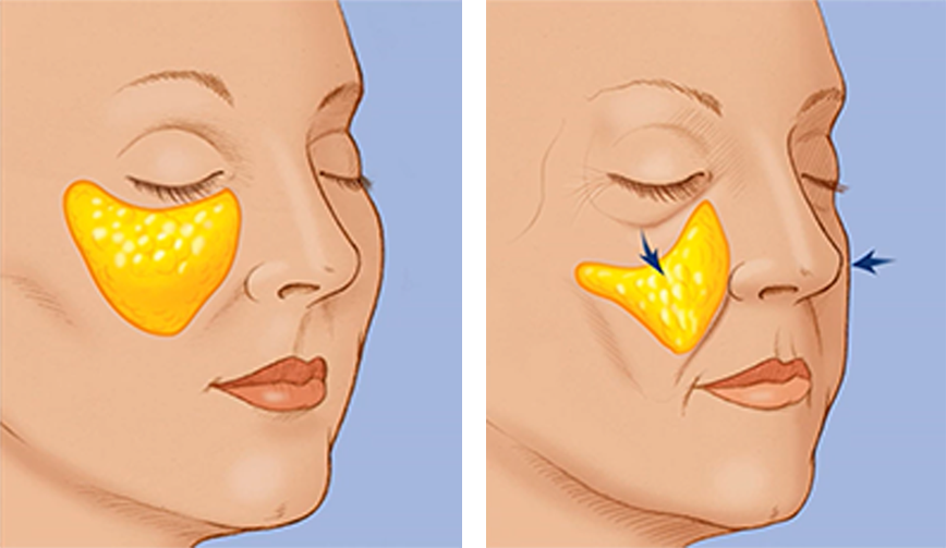 안면부의 노화는 얼굴지방조직의 처짐이 가장 주요한 원인입니다. 눈밑지방이 처지면서 눈밑꺼짐이 발생되고 처진 눈밑지방은 팔자 위에 쌓이면서 깊은 팔자주름이 만들어집니다.