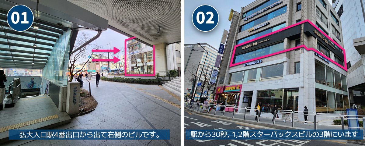 星巴克大楼3楼,弘大入口站4号出口旁边。