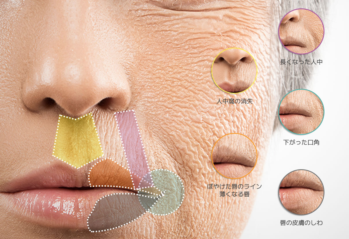 老化が進むと、唇の形を美しくしてくれた多くの筋肉に力の方向が変わります。 張り切っていた筋肉はだんだん力が弱くなり、逆に中にすぼめようとする筋肉の力はますます強くなり、唇の老化の症状が現れます。